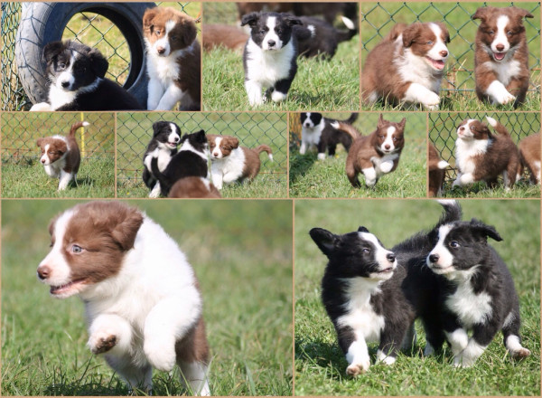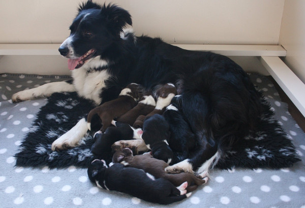 Caithy is bevallen van 8 pups: 3 reutjes en 5 teefjes, zwart-wit en bruin-wit.