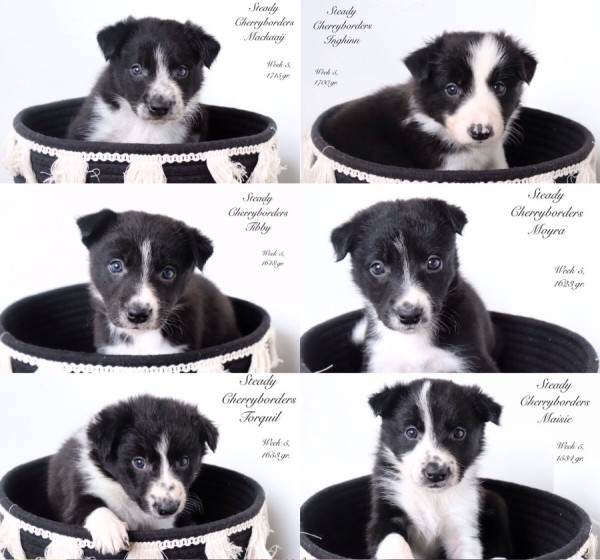 - 08:15 uur - teef - 321 gr. - zwart-wit - Steady Cherryborders Maisie - "kind van licht" - roepnaam: Sally.