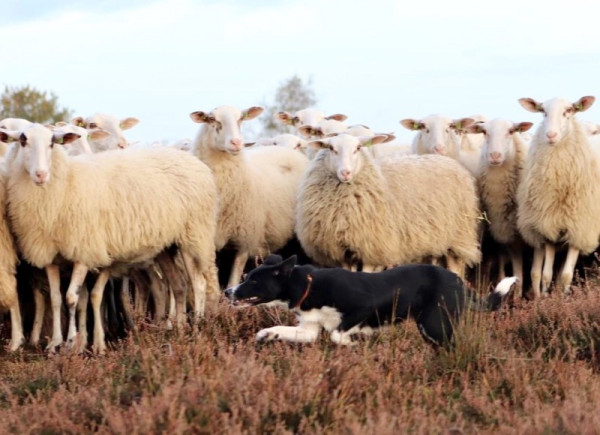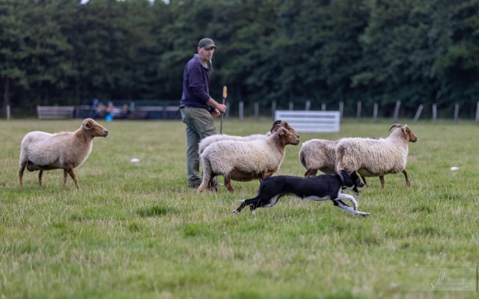 Juli 2021: Tibby (18 mnd.) gaat nu regelmatig mee om de kudde schapen in Ermelo te hoeden.