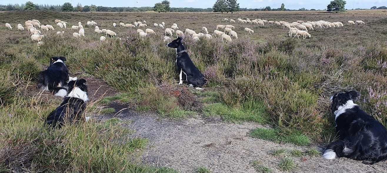 Juli 2021: Tibby (18 mnd.) gaat nu regelmatig mee om de kudde schapen in Ermelo te hoeden.