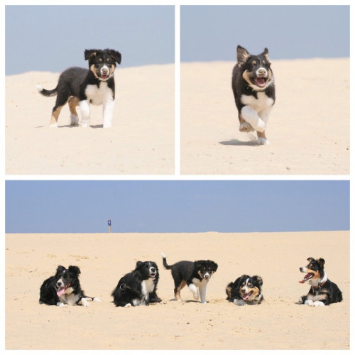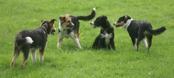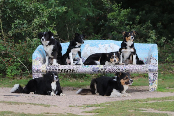 En nu hebben we dus een kleine roedel, die bestaat uit vier bordercollies, waarvan er drie zelfgefokt zijn en de laatste twee